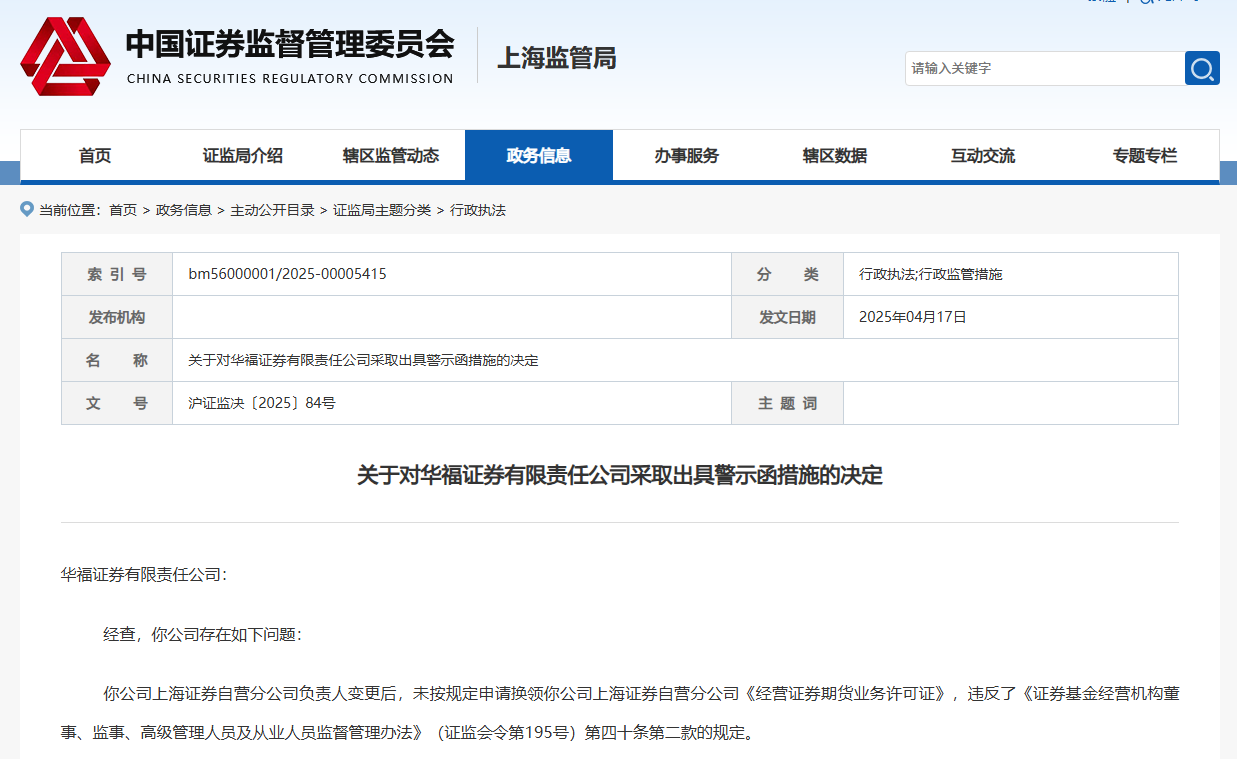 近期,上海证监局对华福证券有限责任公司出具警示函(沪证监决〔2025〕84号),指出其上海证券自营分公司负责人变更后未按规定申请换领《经营证券期货业务许可证》。这一违规行为违反了《证券基金经营机构董事、监事、高级管理人员及从业人员监督管理办法》关于分支机构负责人变更需在5个工作日内报备、20个工作日内换领许可证的规定。