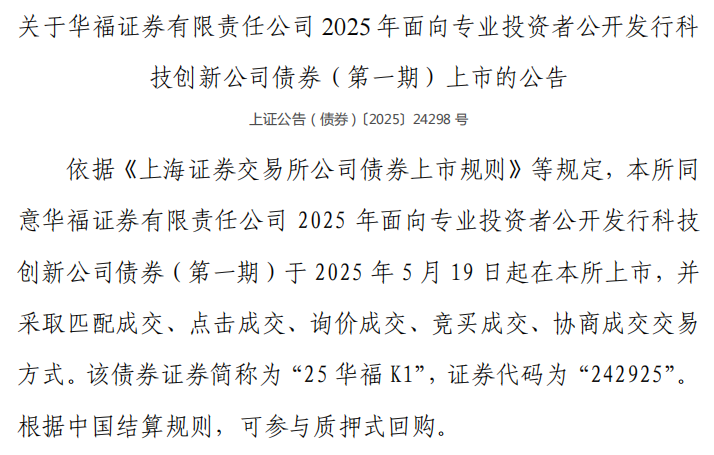 此外,近期还有消息显示,华福证券积极响应资本市场支持科技创新的政策导向。5月15日,华福证券公开发行的科技创新公司债券(第一期)正式上市。此次发行源于2025年5月7日央行与证监会联合发布的政策,该政策首次将金融机构(包括证券公司)纳入科技创新债券发行主体范围,华福证券作为首批获批的券商之一,成功发行5亿元科创债,成为政策落地的首批实践者。